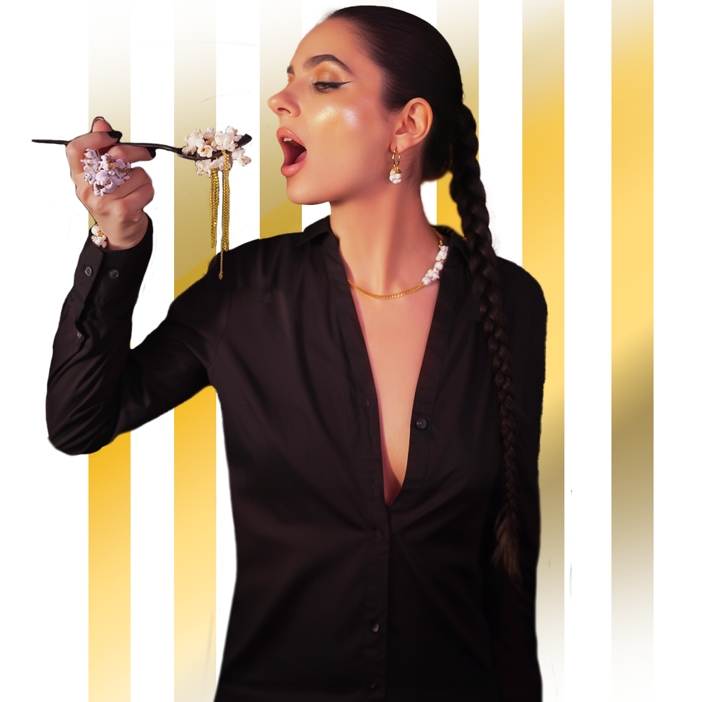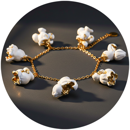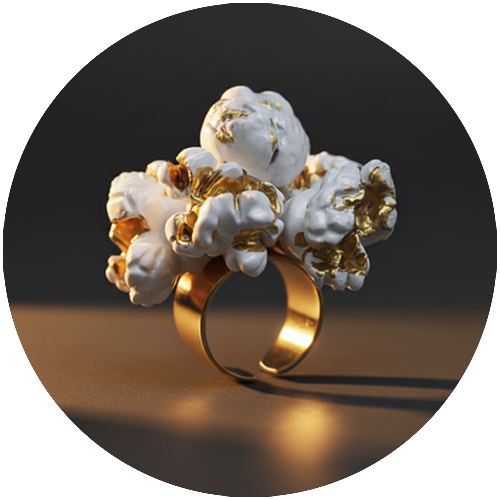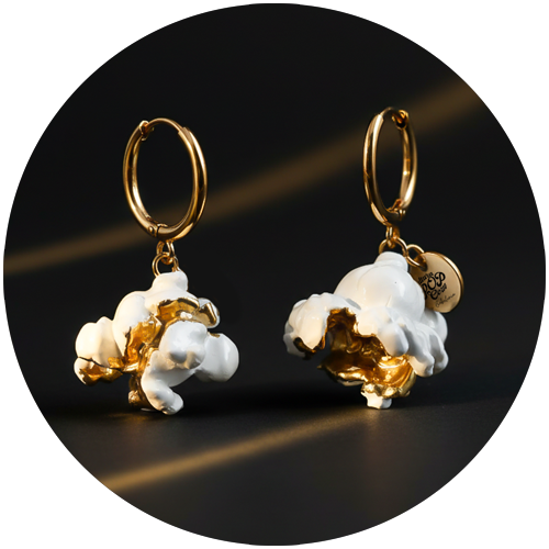 La Collezione PopCorn nasce perché i gioielli troppo belli mi mettevano a disagio. Così, insieme a Fenix, ho deciso di crearne di volutamente brutti. Talmente brutti da diventare belli. Il PopCorn è il simbolo dell’intrattenimento: c’è sempre quando guardiamo, commentiamo e sopportiamo il mondo.